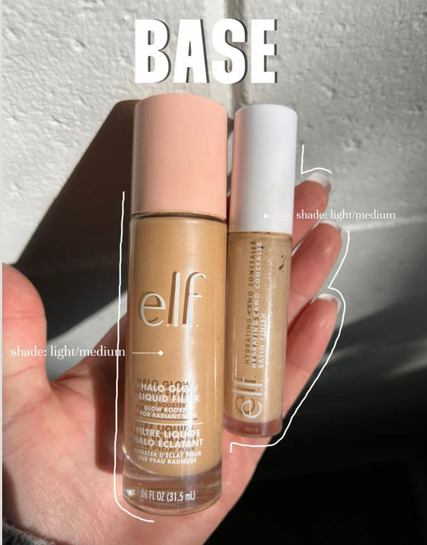 I start by applying my go-to ELF Concealer in Light/Medium under the eyes and on any blemishes or spots that need coverage. Next, I use ELF Halo Glow in Light/Medium to add a subtle, dewy radiance to the skin. This combination instantly brightens the face and creates a smooth canvas for the rest of the makeup.