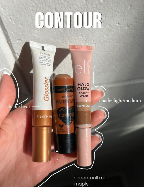 For dimension, I contour using my top three favorites: Glossier Solar Paint in Heat, Wet n Wild Contour Stick in Call Me Maple, and ELF Halo Glow Beauty Wand in Light/Medium. I focus on the cheekbones, forehead, and sides of the nose to create a natural, sculpted look that enhances the skin's glow.
