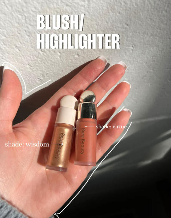 Blush and highlighter are my favorite steps for adding life to the face. Currently, I'm loving Rare Beauty Blush in Virtue paired with their Wisdom highlighter for a soft, radiant finish. For lips, I line with NYX Lip Liner in Espresso and top it off with a swipe of Gisou Lip Oil in Honey Gold for a glossy, hydrated look.