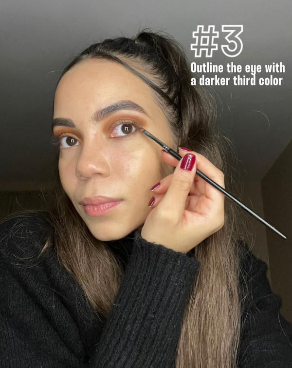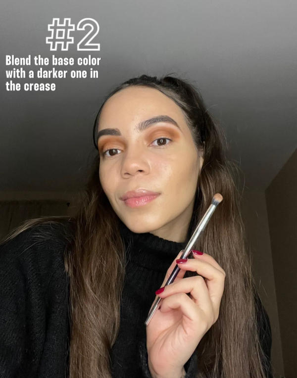 Take a slightly darker color and blend it into your crease. This adds dimension and warmth to the eye, giving it a subtle smoky effect while still keeping the overall look soft and wearable.