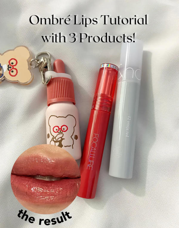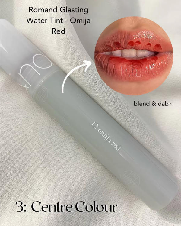 Finally, dab the dark red lip tint in the center of your lips to create depth. Blend it outward using your fingers or a small brush for a soft gradient. This step creates the signature ombré effect, making lips appear fuller and more dynamic.