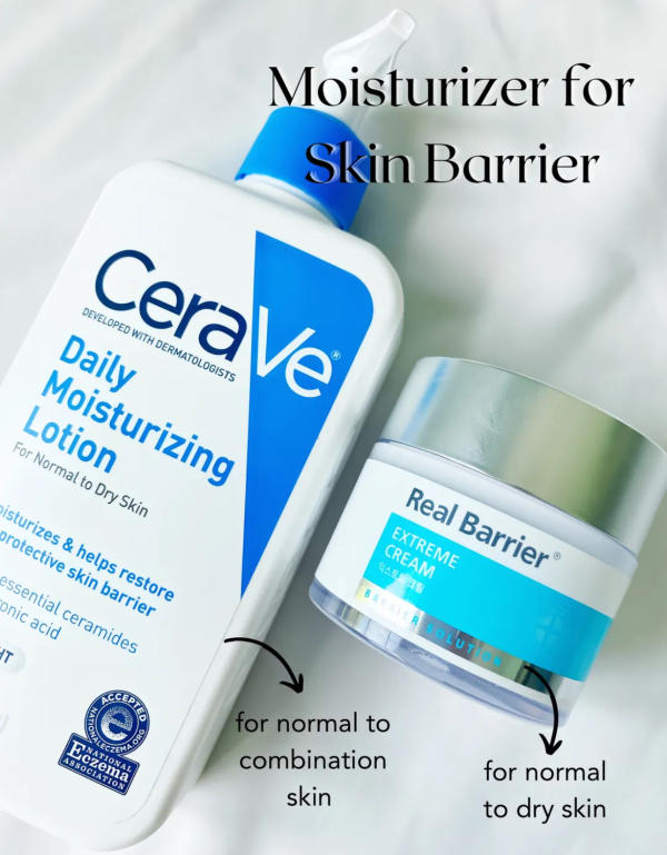 For lightweight, everyday hydration, CeraVe Daily Moisturizing Lotion is a reliable go-to. If the skin is feeling particularly dry, irritated, or stressed, the Real Barrier Extreme Cream provides deep, restorative moisture. Both options are fragrance-free and skin-barrier friendly, making them excellent choices for sensitive skin types!
