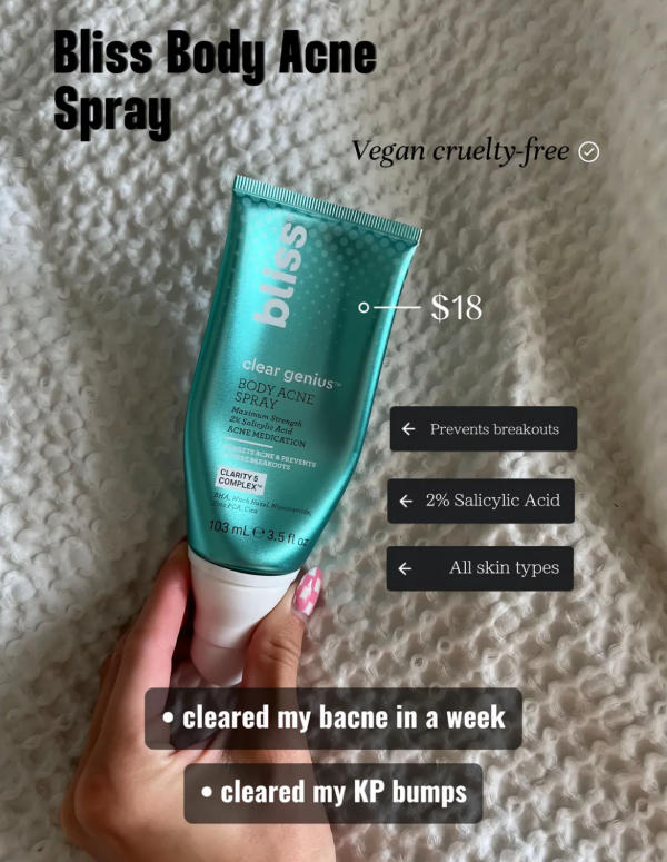 This spray has been a game-changer for me. Packed with salicylic acid and niacinamide, it helps prevent breakouts and clears existing acne. At first, my skin reacted because it wasn’t used to it, but after about a week, my acne significantly reduced and my breakouts stopped. This spray feels like magic in a bottle, and I will definitely repurchase it. It’s worth every penny for anyone struggling with body acne.