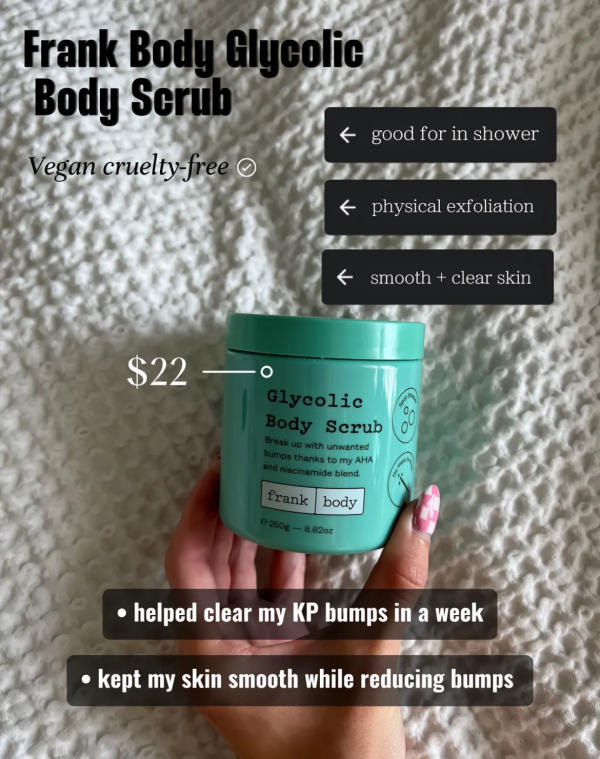 This exfoliating scrub is perfect for tackling KP bumps (keratosis pilaris). The glycolic acid gently smooths the skin, reduces bumps, and prevents them from forming, which is especially helpful during hot, sweaty temperatures. Easy to use in the shower, it has made a huge difference in my skin’s texture. While it’s slightly pricey, it’s a solid investment for anyone wanting clearer, smoother skin.