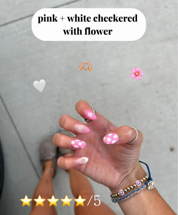 For this set, I combined a pink and white color scheme with a classic French tip. I added full-color flowers and a subtle checkered pattern for a playful touch. These nails turned out amazing and were easily some of my favorite nails of the summer.