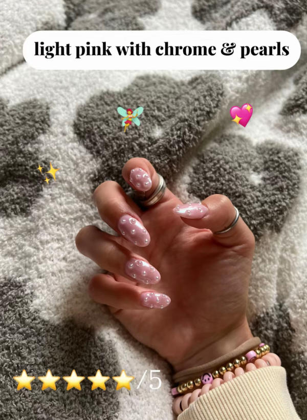 This design featured a light pink base with a reflective chrome finish, accented with tiny pearls. It was completely different from anything I usually get, and I received so many compliments. These nails are perfect if you want a statement set that's both elegant and eye-catching.