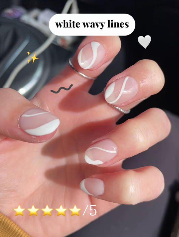 This trendy design features sleek white wavy lines over a neutral base. I got this set for graduation, and it looked polished yet fun. The design is versatile, and you can try it with different colors to match your mood or outfit.
