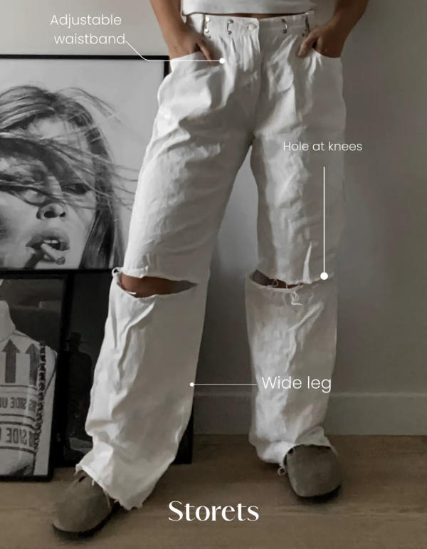 This pair stands out from the rest because it's made from crisp white denim instead of the usual blue. With an adjustable waistband featuring oversized hook-and-eye closures, they're ideal if your size fluctuates. The wide leg cut and distressed knees add an edgy vibe, making them more of a statement piece for days when I want my outfit to feel bold and fashion-forward.