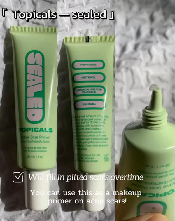 Sealed is a newer product that's particularly impressive. It contains a slow-releasing form of retinol and medical-grade silicone, which helps fill in pitted scars over time. The silicone texture provides a smoothing effect instantly, while the active ingredients work on long-term improvement. This product can be used day and night, but it's essential to wear SPF during the day to protect your skin.
