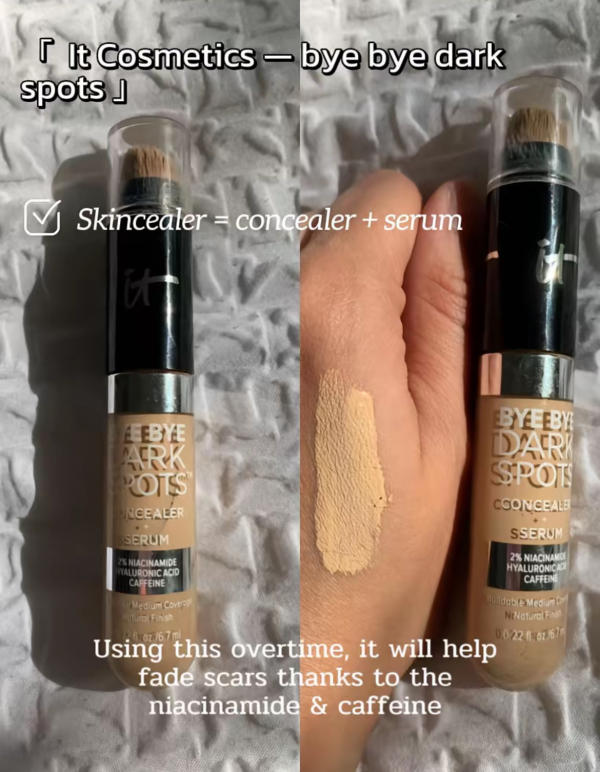 Skincealer is a hybrid product that combines a serum with concealer. It contains caffeine and niacinamide, which brighten dark spots and improve overall skin tone. It's great for long-term use and doubles as an eye concealer, making it both functional and effective for covering and treating acne scars simultaneously.