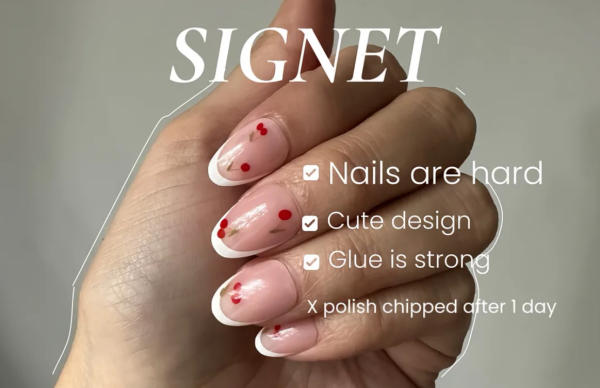 I recently discovered Signet's press-on nails and was excited to try them. Their collection offers a wide range of styles and lengths, and I fell in love with the cherry design. The nails feel sturdy, and the glue is strong, which helps them stay in place.