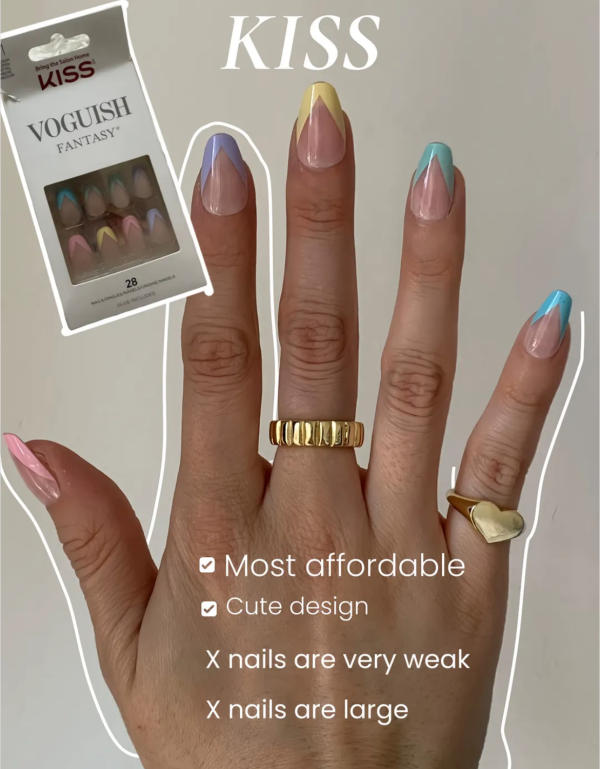 KISS press-on nails are convenient since they are widely available at drugstores, making them a quick option if you need a last-minute manicure. However, the quality leaves a lot to be desired. The nails feel cheap, the polish chips quickly, and the glue is not very strong.