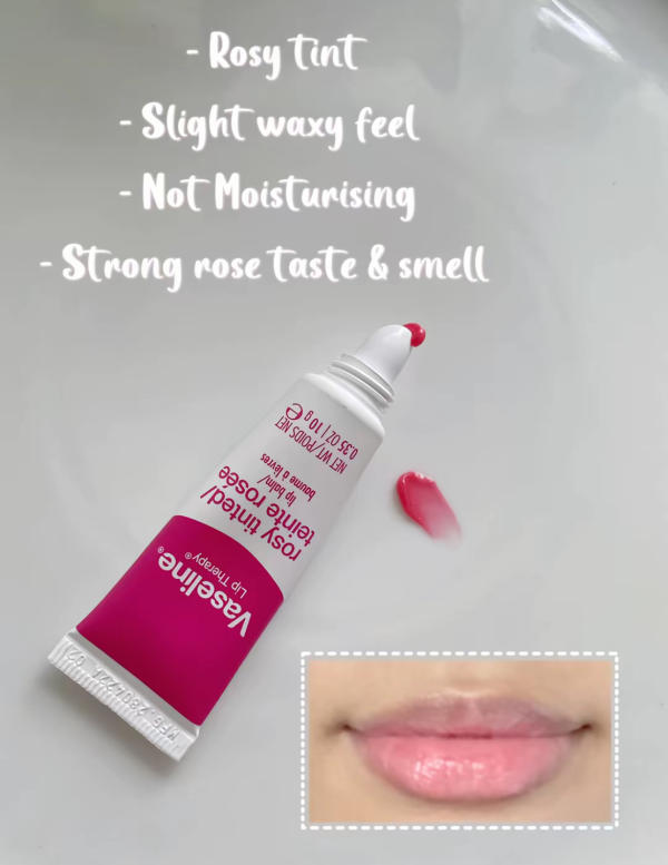 This balm has the classic Vaseline feel—thick and waxy with a pretty rose tint that gives a subtle flush of color. While the texture creates a barrier on the lips, it doesn’t deeply moisturize, so it’s better for temporary shine than long-lasting softness. The rose scent and taste are quite strong, which some may love, while others might find it overpowering.