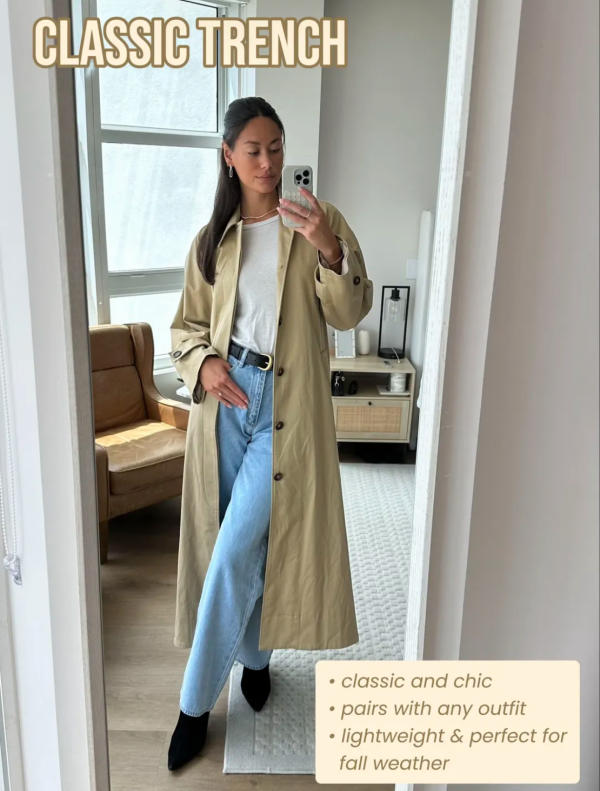 A trench coat is a timeless wardrobe essential. A camel-colored trench instantly feels like fall and pairs effortlessly with almost any outfit. You can style it in multiple ways—left open for a relaxed vibe or belted for a more polished, chic look. Two of my favorites are the trench from L’academie on REVOLVE and the oversized version from Oak + Fort, both perfect for layering over casual or dressy ensembles.
