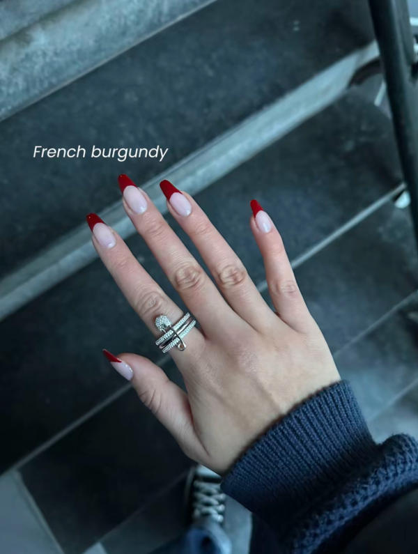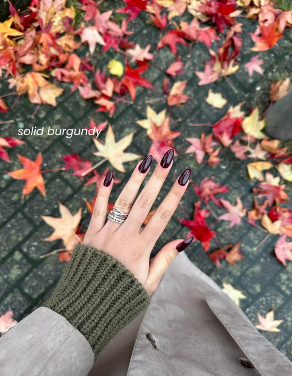 For a playful twist, combine solid burgundy with accent nails, such as glitter, matte finishes, or minimal patterns. This adds personality while keeping the overall look chic and seasonally appropriate.