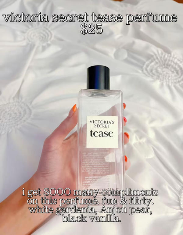 Finish your scent routine with Victoria’s Secret Tease perfume. This flirty and feminine fragrance combines white gardenia, Anjou pear, and black vanilla. It’s perfect for turning heads, giving off a confident, charming energy. Layered with the body wash and butter, it creates a sweet, lasting scent that’s both fun and elegant.