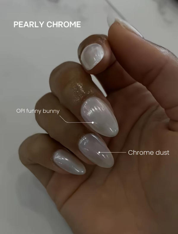 Let’s start with the viral favorite — the pearly chrome nails made famous by Hailey Bieber. They’re subtle yet mesmerizing, perfect for adding a hint of glow without being too flashy. The look is created using an OPI Funny Bunny base and a fine chrome powder buffed over the top for that dreamy, pearlescent finish.