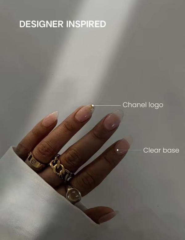 Sometimes, a little detail makes the biggest statement. This look features clear GelX extensions with a sheer polish that lets your natural nail color peek through. The highlight? A tiny gold Chanel logo placed on one nail of each hand — refined, understated, and chic. You can easily swap the logo for any other designer emblem to match your aesthetic. It’s luxury in the most minimal form.