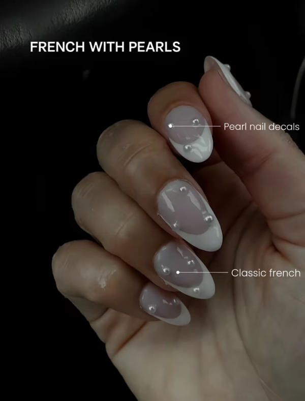 A twist on the timeless French manicure, this version is perfect for special occasions. The classic white tips get a glam upgrade with delicate pearl decals that bring an extra touch of elegance. These nails were made for sunlit vacations and fancy dinners — though they might not last as long as your usual set, they’re worth it for that polished, graceful look.