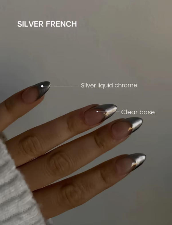 For those ready to step slightly outside the neutral zone, the silver chrome French tip is the perfect experiment. Think of it as a modern take on the French manicure — clear base, metallic tips that look like they’ve been dipped in liquid metal. It’s sleek, fashion-forward, and ideal for those who love a little futuristic shine while keeping it clean and minimal.