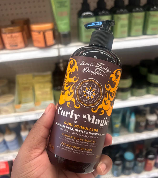 Finish with a curl-defining gel to enhance your natural curl pattern. Uncle Funky’s Daughter Curl Magic Gel provides hold, shine, and long-lasting definition without crunchiness, keeping curls bouncy all day.