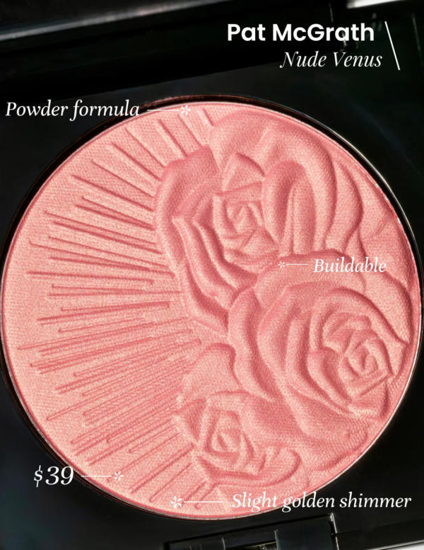 This powder blush leans toward a soft peachy pink, with a whisper of gold that gives the skin a gentle glow. It’s lightweight, blends effortlessly, and adds just enough radiance without turning overly shimmery.