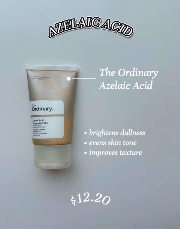 Azelaic acid is great for improving both texture and clarity. It gently exfoliates to remove dull surface cells and targets uneven skin tone. It's also beneficial for those prone to breakouts since it helps calm inflammation while promoting smoother skin.