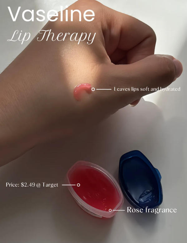 For a more budget-friendly option, Vaseline’s “Rosy Lips” is a small but mighty lip balm. Its compact size makes it perfect for on-the-go use, and it doubles as a nighttime lip mask to keep lips soft while sleeping. While it doesn’t provide a glossy finish like the Glow Recipe balm, it excels in hydration, which is the main goal during colder months.