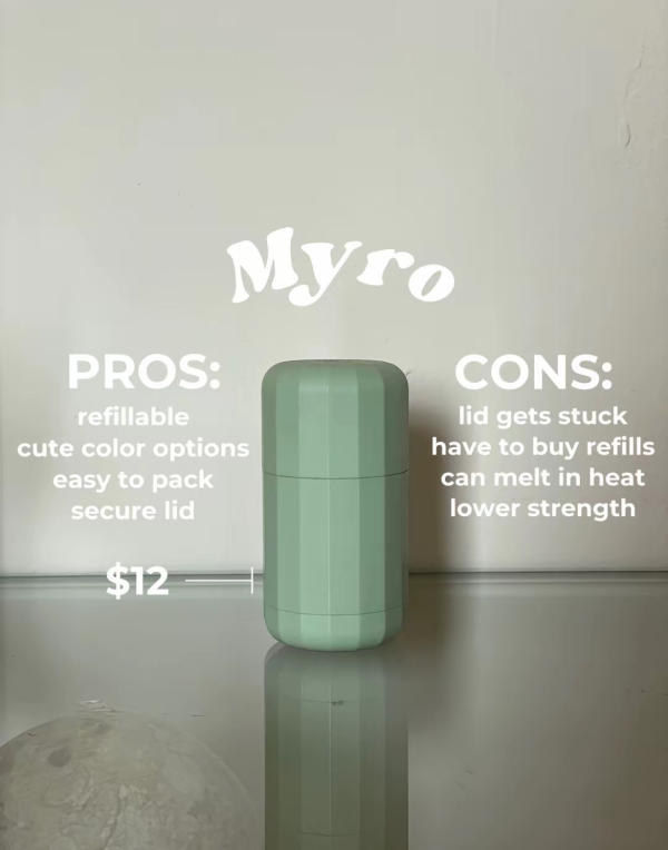 Myro stands out for its customizable and refillable design, which is perfect for sustainability-minded travelers. The cases can be personalized, and it's easy to swap in new deodorant inserts rather than buying an entirely new stick. While it hasn't melted for me, the lid can occasionally stick, which is a small inconvenience compared to its overall practicality and eco-conscious appeal.