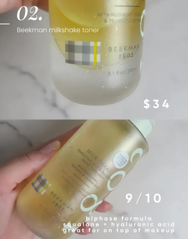 If your goal is radiant, glassy skin, this one's your go-to! The Beekman 1802 Milk Shake Toner preps your skin beautifully while adding that subtle, dewy sheen. It works great both in your skincare and makeup routine — perfect for spritzing before or after makeup to reduce powdery texture and give your complexion a natural, hydrated glow. It's gentle, lightweight, and gives skin that healthy bounce that makes it look instantly refreshed.